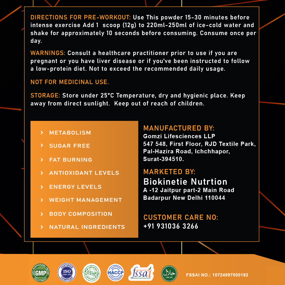 BioKinetic Pre Workout is designed to fuel your body with energy, endurance, and focus for intense training sessions. Packed with premium ingredients, it boosts stamina and helps you push through your toughest workouts. This powerful pre-workout formula supports strength, mental clarity, and muscle performance, ensuring you stay energized and motivated. Perfect for athletes and fitness enthusiasts, it prepares your body to perform at its best and achieve your fitness goals.